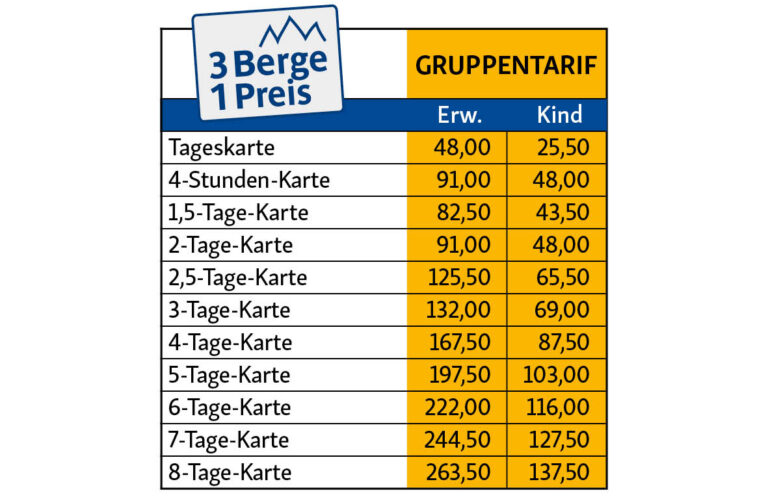 Gruppen ab 20 Personen erhalten diesen Tarif, zusätzlich gibt es 1 Freikarte pro 20 zahlenden Personen.